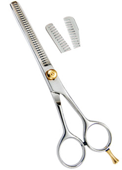 Product: Thinning Shear 6.5 Detail: Double Edge Thinning Shear 32-Teeth Size 6.5" Bright Mirror Finish, Golden adjustable screw and finger rest, packed in colored triangle PVC pouch with hanging hole.