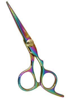 Product: Razor Edge Hair Shear 5.5" Detail: Razor Edge Hair Shear Size 6.5" Rainbow Titanium Coated Finish, Golden Adjustable screw, Made of Stainless Steel, Packed in Colored Triangle PVC Pouch.