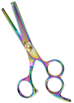 Product: Thinning Shear 6.5" Detail: Comfort Control Thinning Shear 28-Teeth Size 6.5" Rainbow Titanium Coated Finish, Golden adjustable screw, packed in colored triangle PVC pouch with hanging hole.