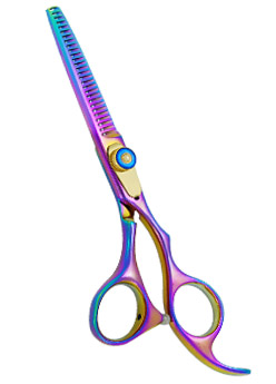 Product: Thinning Shear 6" Detail: Thinning Shear 28-Teeth Size 6" Rainbow Titanium Coated Finish, Adjustable screw & finger rest, packed in colored triangle PVC pouch with hanging hole.