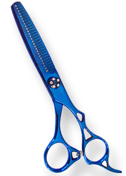 Product: Thinning Shear 6.5" Detail: Thinning Shear 35-Teeth Size 6.5" Blue Titanium Coated Finish, Adjustable screw & finger rest, packed in colored triangle PVC pouch with hanging hole.