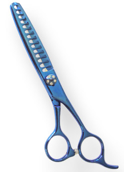 Product: Thinning Shear 6.5" Detail: Thinning Shear 14-Teeth Size 6.5" Blue Titanium Coated Finish, Adjustable screw & finger rest, packed in colored triangle PVC pouch with hanging hole.