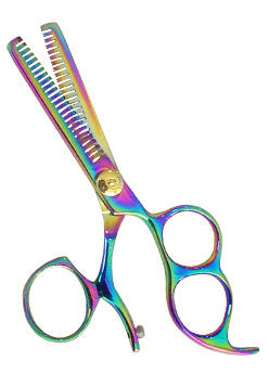 Product: Thinning Shear 5.5" Detail: Thinning Shear 24-Teeth Size 5.5" Rainbow Titanium Coated Finish, Adjustable screw & finger rest, packed in colored triangle PVC pouch with hanging hole.