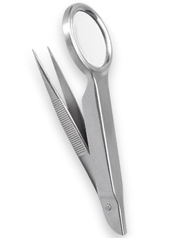 Product: Fine Tip Tweezers with Magnifying Glass Detail: Fine Tip Tweezers with Magnifying Glass Size 3.75" Satin Finish, Made of Stainless Steel, Packed in colored PVC pouch with hanging hole.