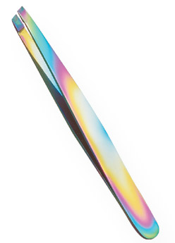 Product: Slanted Tip Tweezers Detail: Slanted Tip Tweezers Perfect for Removing Ingrown Hair Size 3.75" Rainbow Titanium Coated Finish, Made of Stainless Steel, Packed in colored PVC pouch with hanging hole.