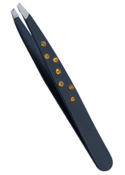 New Designed Slanted Tip Tweezers Perfect for Removing Ingrown Hair Size 3.75" Black Color Coated Finish with Golden Crystals, Made of Stainless Steel, Packed in colored PVC pouch with hanging hole. |