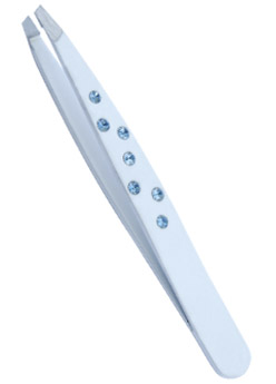 New Designed Slanted Tip Tweezers Perfect for Removing Ingrown Hair Size 3.75" White Color Coated Finish with Blue Crystals, Made of Stainless Steel, Packed in colored PVC pouch with hanging hole. |